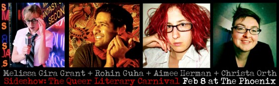 Join us at Sideshow TONIGHT with readers Melissa Gira Grant, Rohin Guha, Aimee Herman, and Christa Orth.