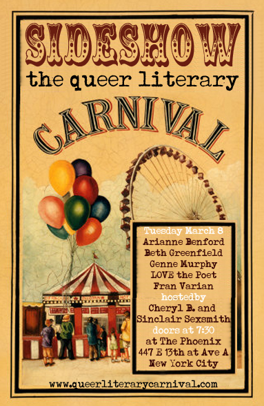 Join us at Sideshow on March 8th with readers Arianne Benford, Beth Greenfield, Genne Murphy, and LOVE the Poet.