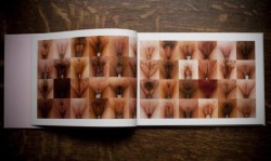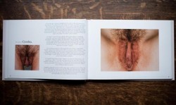 I’ll Show You Mine edited by Wrenna Robertson is a beautiful hardcover coffee table book that came out in February 2011 from Show Off Books. It features 120 photographs of 60 women’s genitals, and accompanying each woman’s photos is text written by the woman, detailing her challenges and/or successes as pertains to her relationship with her genitals. According to the website, there are two trans women included in the book (Ashley and Emily), and the book’s introduction says that the range of age is from 19 to 60. I notice a lot of piercings—more than I thought would be included—and that the majority of those photographed seem to be partially shaved or at least heavily trimmed, but there are some very full hairy bushes in there too.
