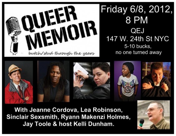 Queer Memoir: New York’s award-winning LGBT storytelling series is breaking their usual “no shows in the summer” tradition in order to produce this special event. We’ll be hearing stories from butch/stud identified people of different queer generations, including a special reading from West Coast’s Jeanne Cordova and her award-winning memoir, When We Were Outlaws.