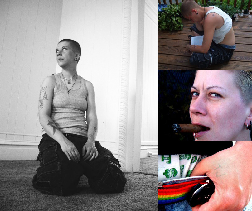 “1. Reading “Butch Is a Noun” and learning that there are others. 2. Butch dyke with a cigar hanging out of her mouth? Yesplz. But it’s more the eyes. 3. Her son’s name on her hand, holding onto the knife, the boxers, the rainbow. The picture took itself. 4. One of my favourite photos of her.”