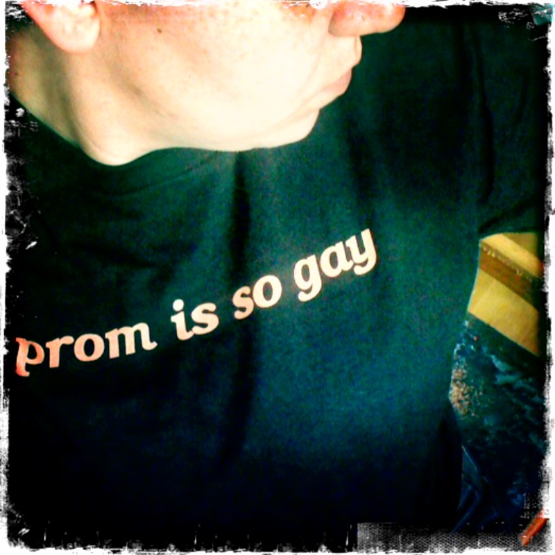 It arrived! My “Prom Is So Gay” tee shirt from Just Like Jesse James. I feel a little weird wearing it, I feel the need to explain the use of “gay” pejoratively around people I don’t know especially. But I did wear it to The Bulldyke Chronicles (and pimp it when I read a quick poem), and it seemed like the audience understood that it is a reference to Candace McMillan.