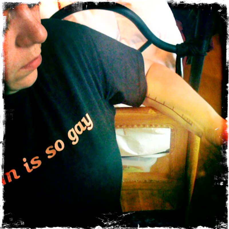 And while I’m taking photographs, here’s a shot that caught my new tattoo in it too. It’s a 6″ ruler, positioned 2″ from my palm which means I can measure things to 8″ when I place my palm flat against something. I’ve been thinking about this one for a long time (it even made an appearance in a poem from last year, which was one of three I read at Bulldyke Chronicles).