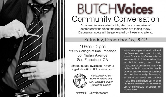 BUTCH Voices presents our first Community Conversations event happening on December 15th, co-sponsored by the Queer Resource Center at City College San Francisco.