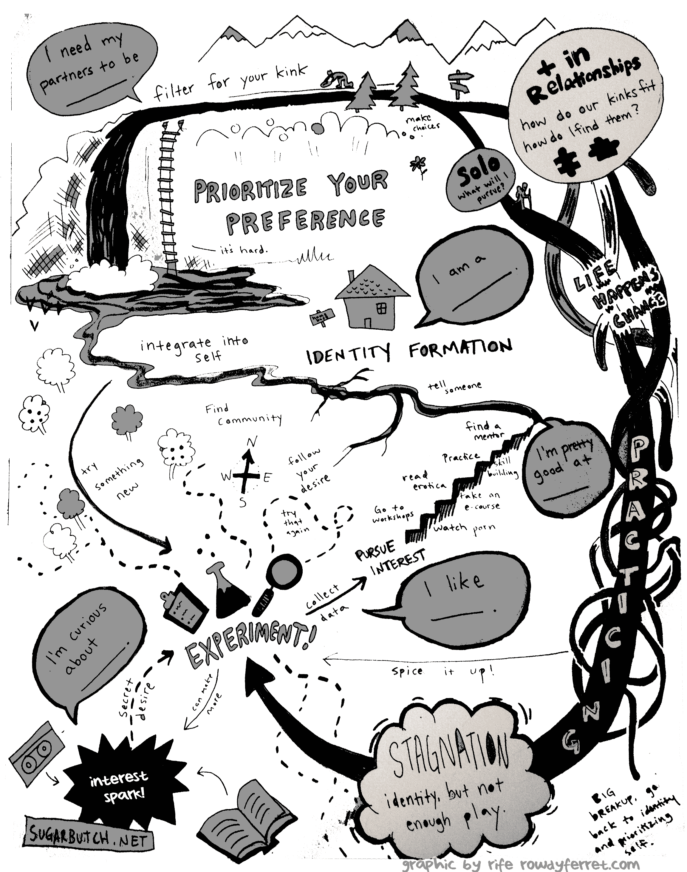 Always the visual processor, rife drew and took notes and drew some more, until he came up with this: the Kinky Desire Map. It’s a map of the process—to the best of rife’s and my ability to express, anyway—of developing a kinky identity and coming into prioritizing kinky desire. This isn’t the process everyone takes, of course, and it’s not necessarily linear, or exhaustive—but I do see a lot of common progressions with all the folks I’ve talked to about identity and kink, so we’ve tried to capture that here.