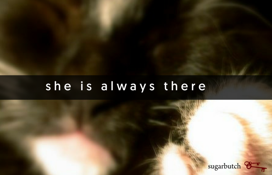 Every morning, she is there in the bed. You wake up and greet the return of the sun with relief, and then remember the destruction of your life, not yet able to lean on the building of the new life. But she is there in the bed. She is curled next to your belly or behind your knees, a little black and white cat not so little anymore, sometimes sleeping tucked under the covers when it’s cold, sometimes her head on the pillow. She makes eye contact, purring. She knows something already, knows the hurting that pours off of you, and she catches it. She puts her paws on you. She closes her eyes slowly and it’s a nod, it’s a greeting, it’s acknowledgement. You hold her. She fits in your curled up body. You pet her. She soothes your nervous system, already activated, already high alert with the tenth breath of the morning.