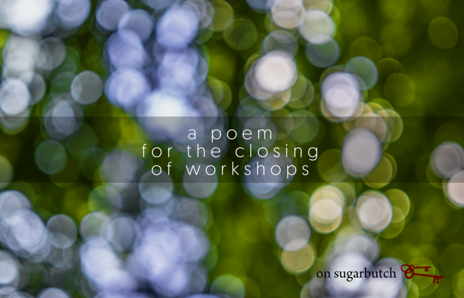 When we leave here: reach out. We journeyed together and we can look again at each other with blinking eyes and say yes, that happened. Yes, our siren screams of pleasure brought the nourishing rains to soak the soil. Yes, fingers ankles collarbone hips. Yes, hello again beloved.