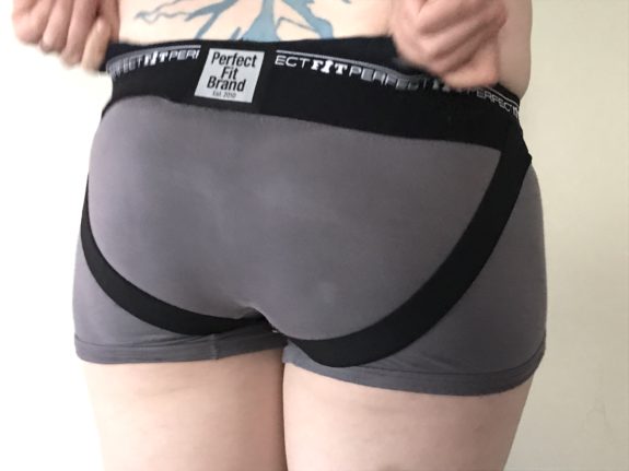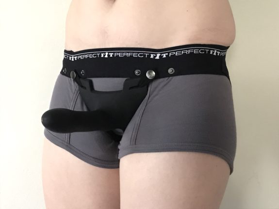 It comes with an elastic waistband — it won’t really work in other harnesses, but it doesn’t need to, because the jock strap style elastic is as comfy as wearing underwear. The site says the waistband is for all gender wear, and it fits waist sizes 24-40″. As someone on the top end of that spectrum, I gotta say, it was perfectly comfortable to wear. And as rife just said this morning when I asked him to put it on so I could take some photos, “How does this fit you? It fits me perfectly.”