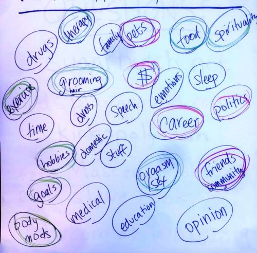 One way to sort these is to write all your categories out on paper, then use different colors to denote which ones are which. Red could mean “no, I will keep control,” yellow/orange could mean, “maybe, depending on circumstances,” and green could mean, “yes, I would like my dominant to have control over these.”