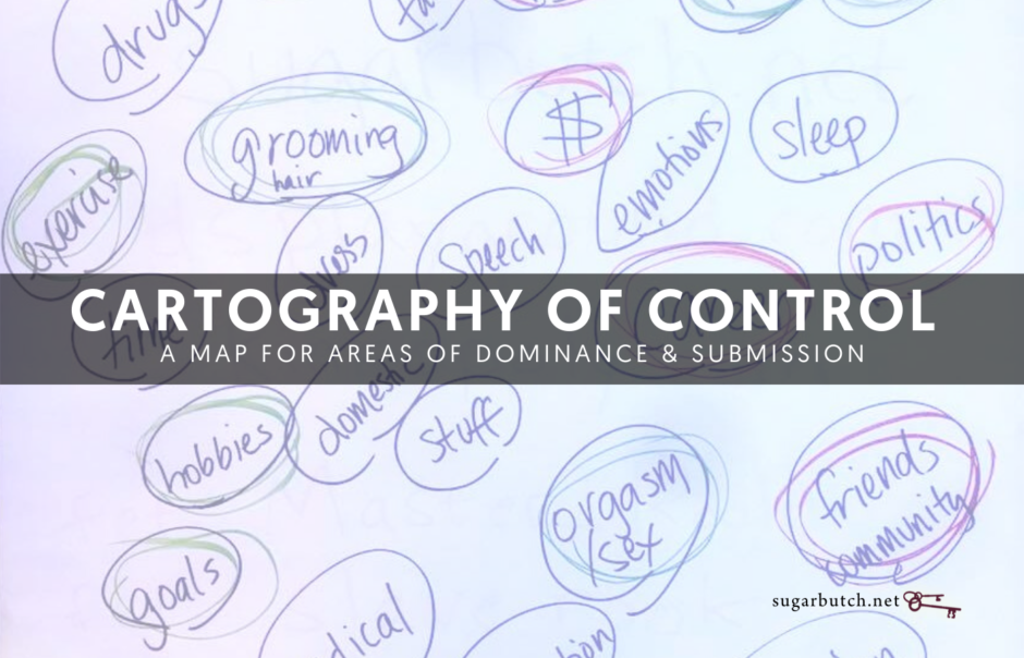 The cartography of control maps out areas of someone’s (generally the s-type) life, and codes them into categories to share which areas they would like to have under someone else’s control and which areas they would like to keep for themself.