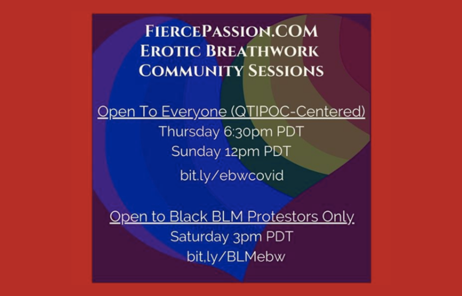 She has two special community offerings through the end of August: community erotic breathwork, and BLM Protesters’ sessions.