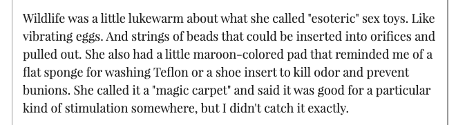 [image text:] Wildlife was a little lukewarm about what she called “esoteric” sex toys. Like vibrating eggs. And strings of beads that could be inserted into orifices and pulled out. She also had a little maroon-colored pad that reminded me of a flat sponge for washing Teflon or a shoe insert to kill odor and prevent bunions. She called it a “magic carpet” and said it was good for a particular kind of stimulation somewhere, but I didn’t catch it exactly.