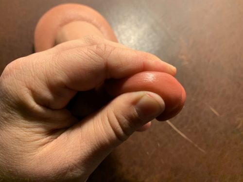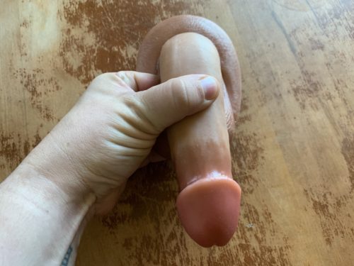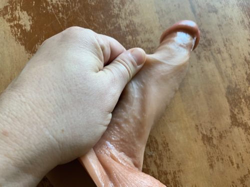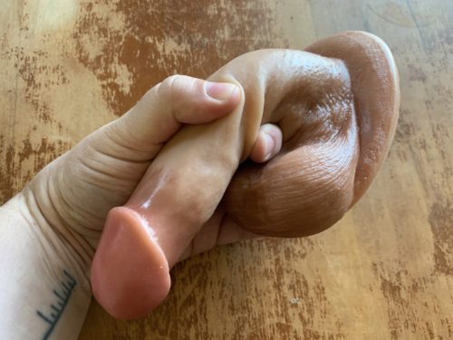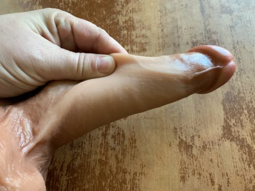 Speaking of movable foreskin: Remember this review of the “King Cock” by DocJohnson? Yeah, no. That one really didn’t hold up. The material is terrible and just continued to be terrible. It has such a strong off-gassing smell, even now, two years later, that I would not want it to be in anyone’s mouth because of the smell, and if I don’t want it in someone’s mouth, I definitely don’t want it in any other holes. I was skeptical of their material, but the appeal of movable foreskin was just too tempting.