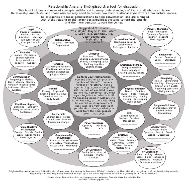 The relationship smorgasbord is technically titled the relationship anarchy smorgasbord. If you haven’t poked around in the relationship anarchy structures, it’s worth doing — again, even if you are monogamous and don’t have multiple partners! You still have multiple relationships with family, friends, work, community, and more. Amelia Lichtenberg has a good, basic write-up on relationship anarchy, and there are many, many more writings and thinkings online.