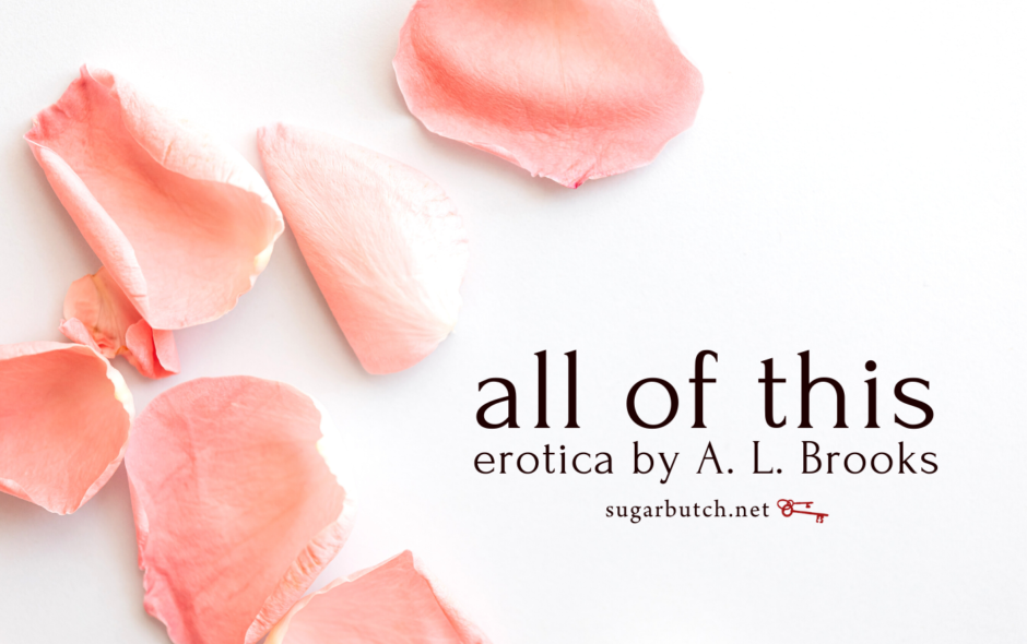 Content: marriage proposal, transmasc/femme, top surgery, daddy/girl, age play, blow job, fingering, strap-on, fucking, crying, D/s, possession. Characters are consenting adults. Cam proposes to me … Continue reading All Of This, Guest Erotica by A. L. Brooks