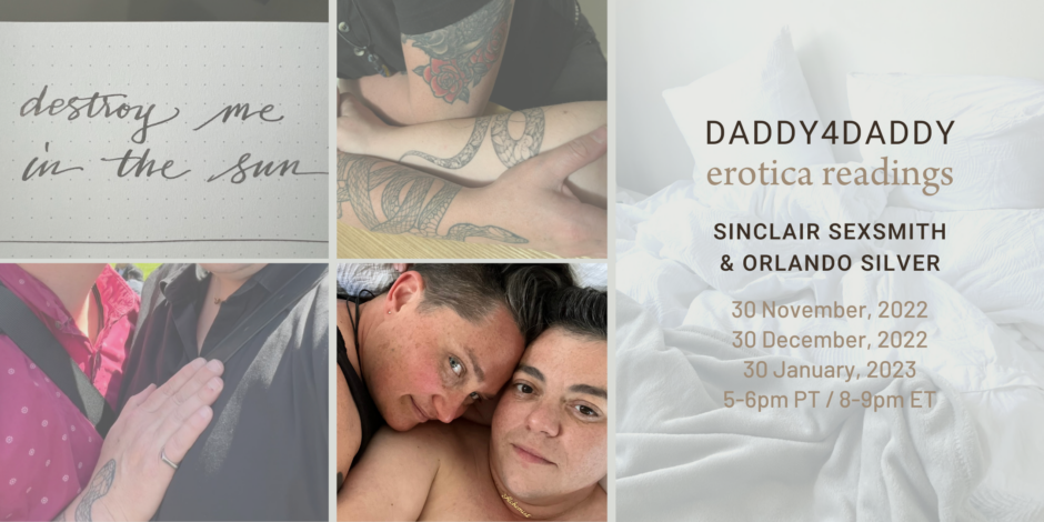 We’ll be reading rough drafts, unpublished, and so far unheard works about daddy4daddy romance, sex, kink, and big feelings. Ask us questions ahead of time and we’ll choose some of our favorites to answer. Come see them both try to make each other blush.