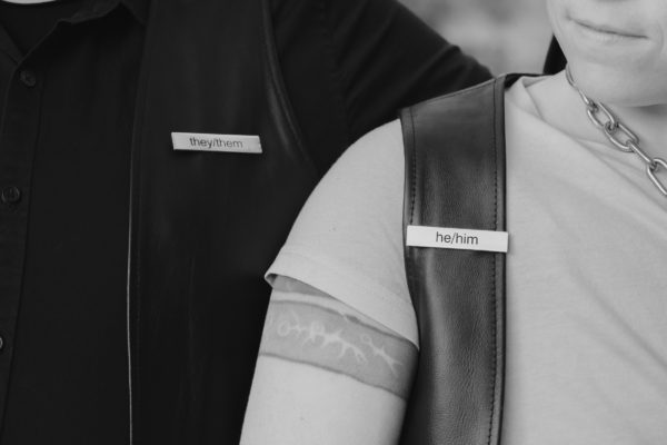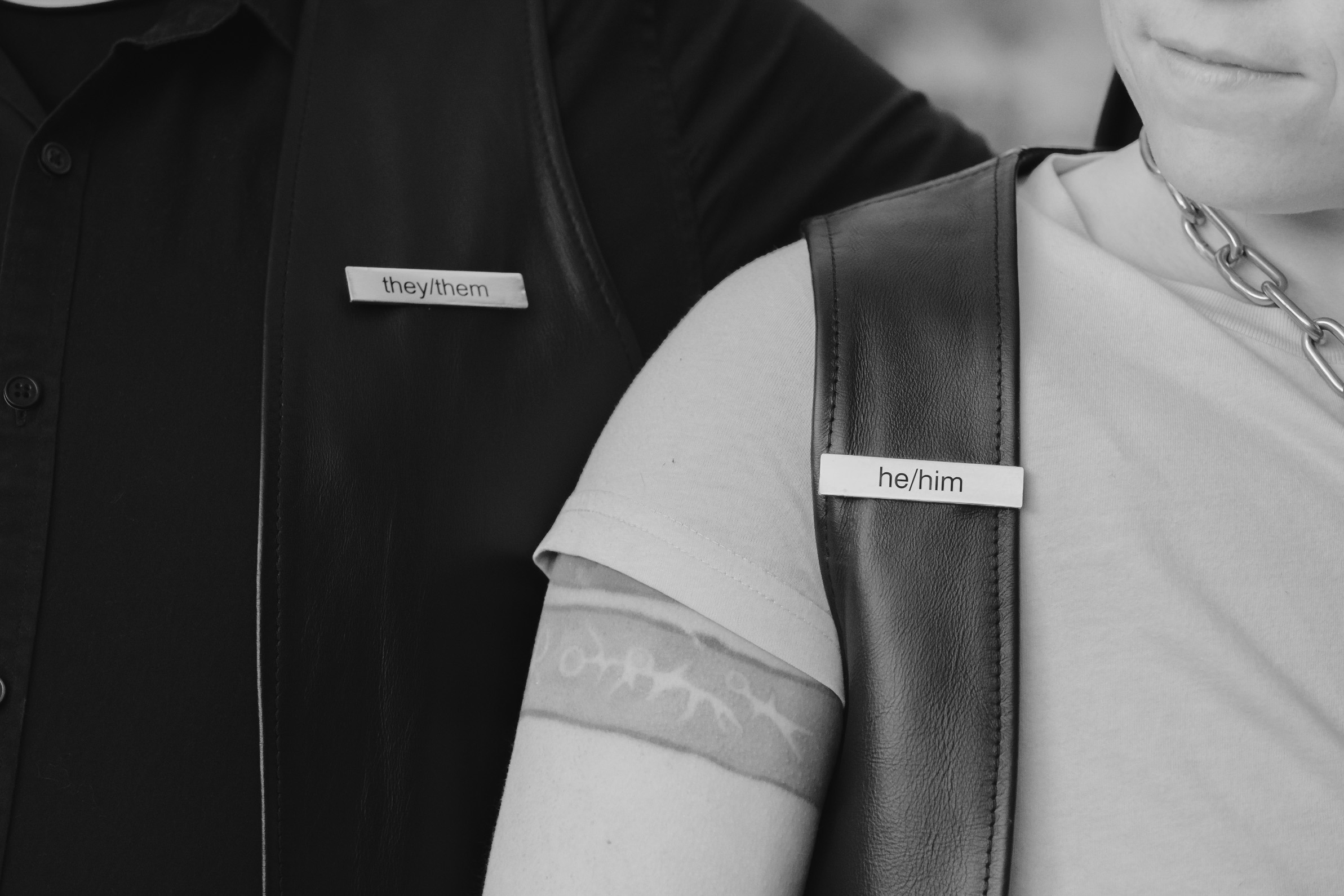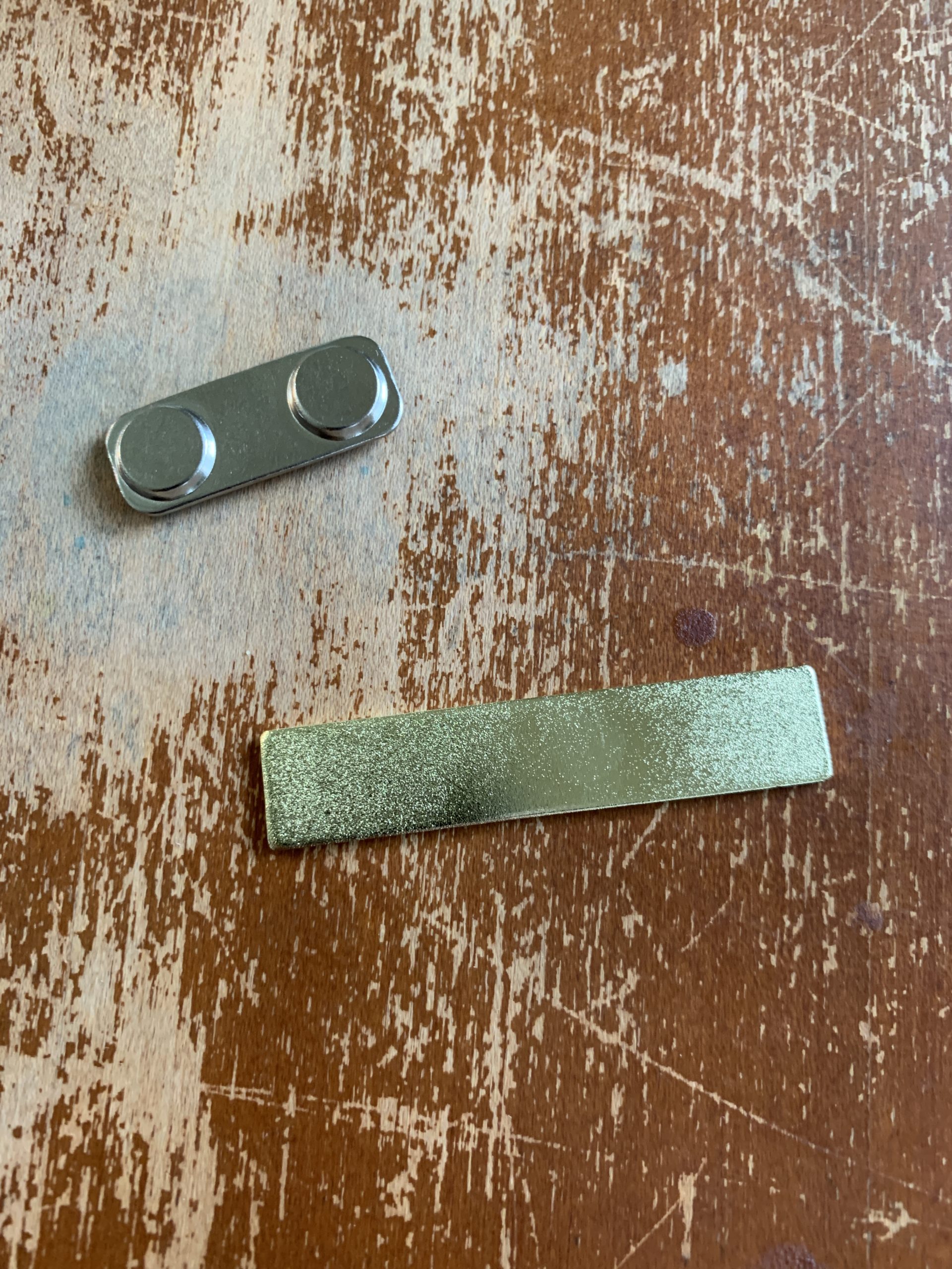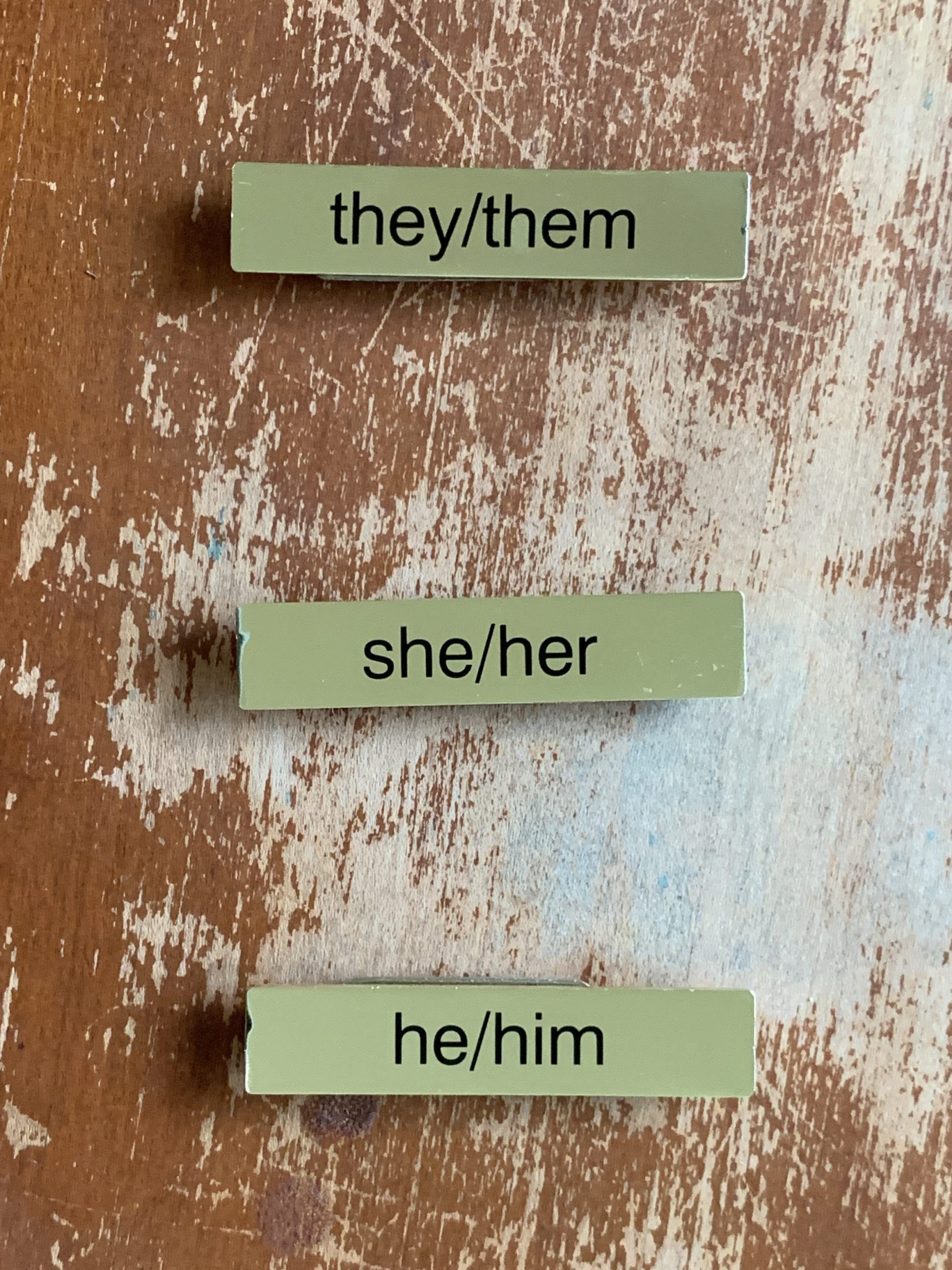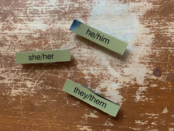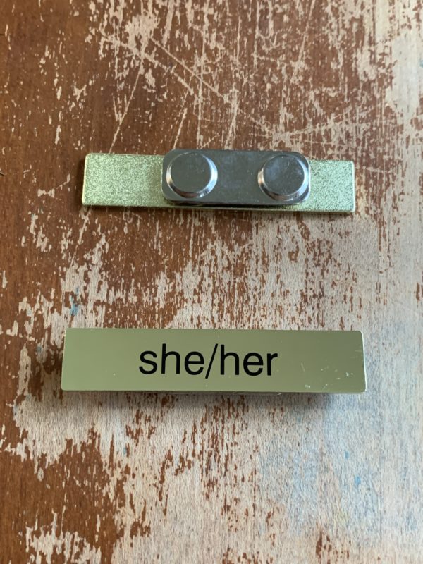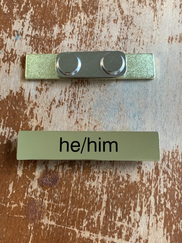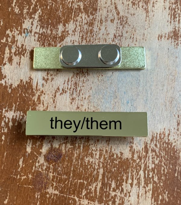 These pins are small brass nameplates with either she/her, he/him, or they/them pronouns listed in lowercase font. They attach via a strong magnet so they do not pierce your clothes, jacket, or leather.