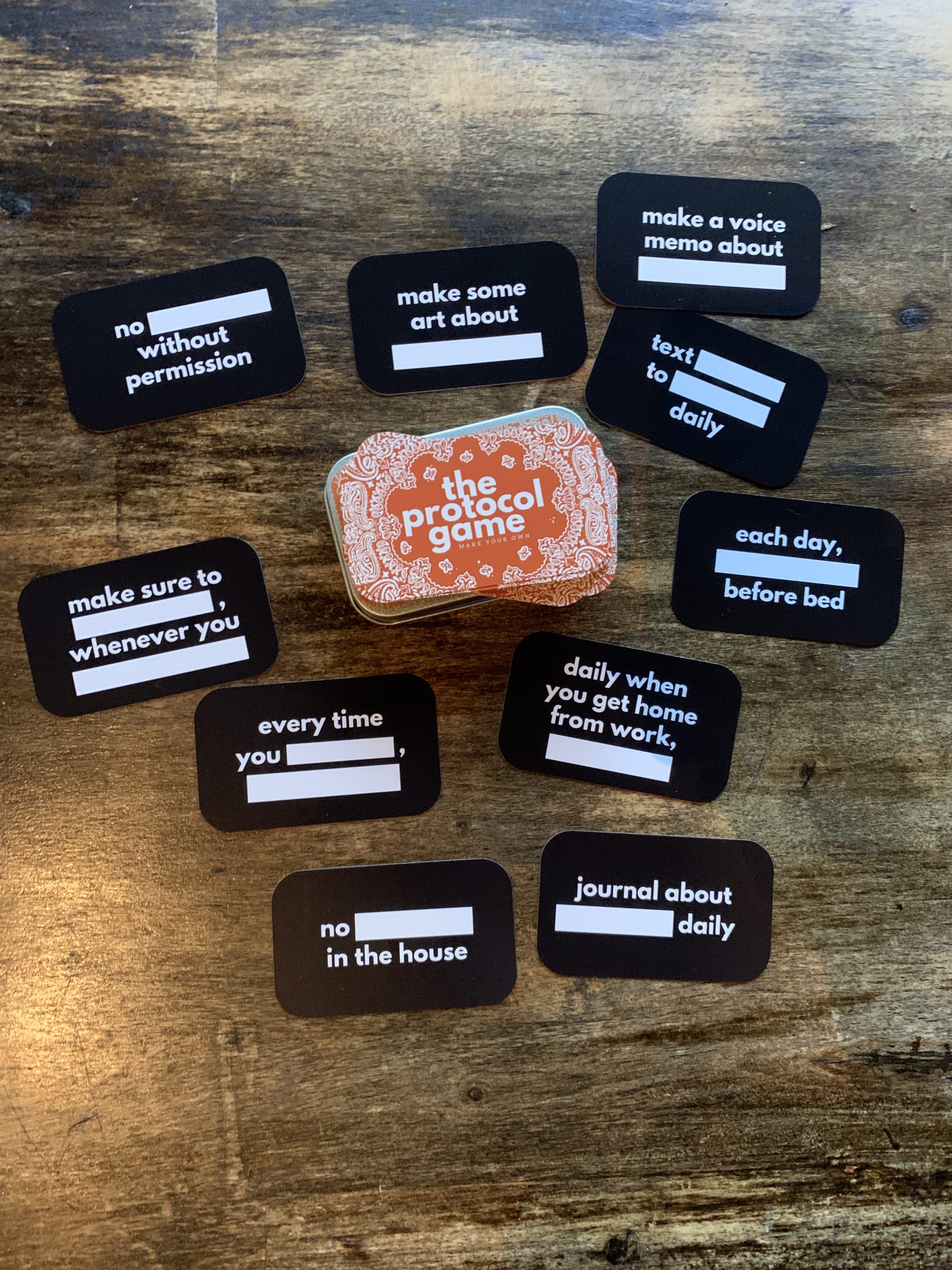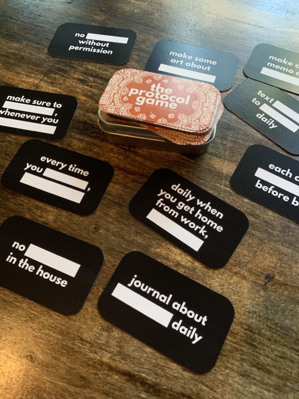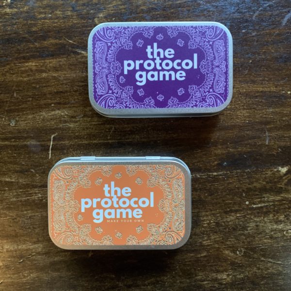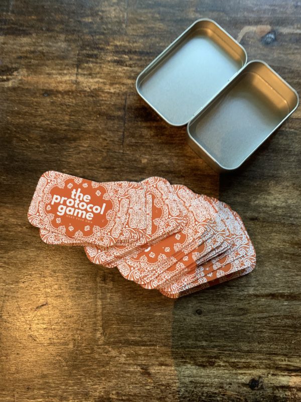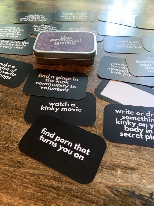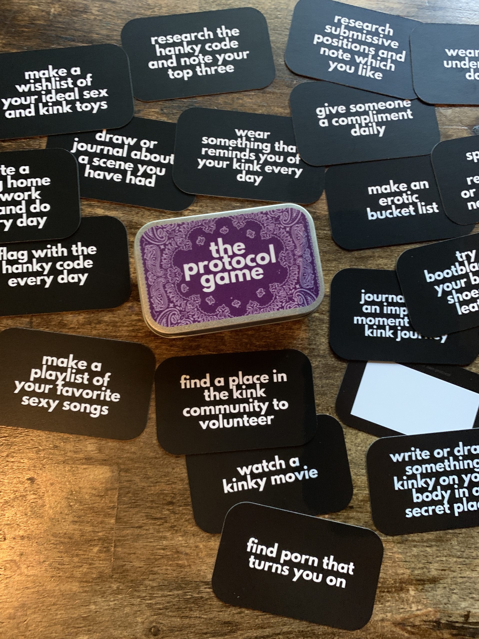 The Protocol Game Card Deck is 52 cards with different protocol for you to pull by yourself, with a D/s partner, or with friends. Use it however you want!